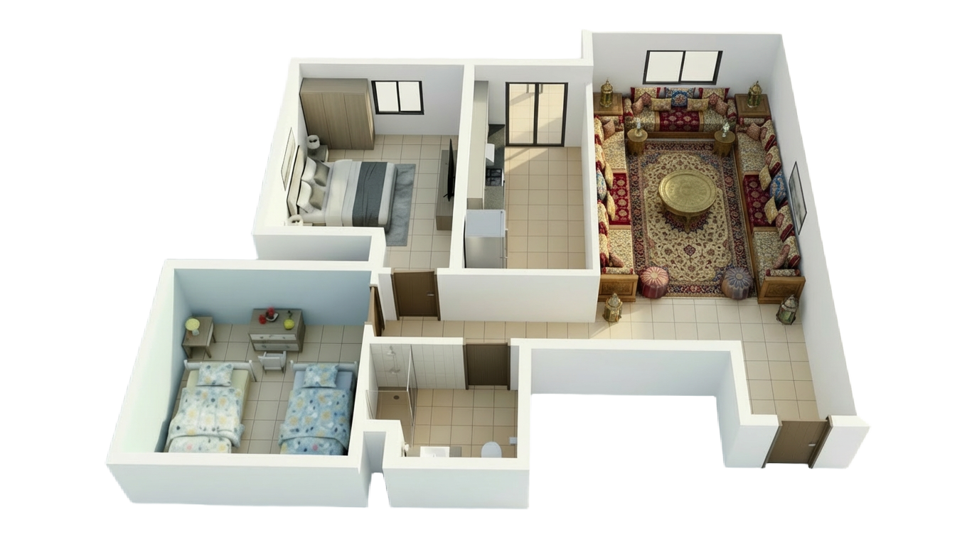 شقق فاخرة بتصميم عصري يجمع بين الأناقة والعملية؛ تضم 2 أو 3 غرف نوم بخزانات مدمجة، ومطبخاً بجودة عالية. تم اختيار أرقى المواد وأدق التشطيبات لضمان جمالية استثنائية ومتانة مستدامة
